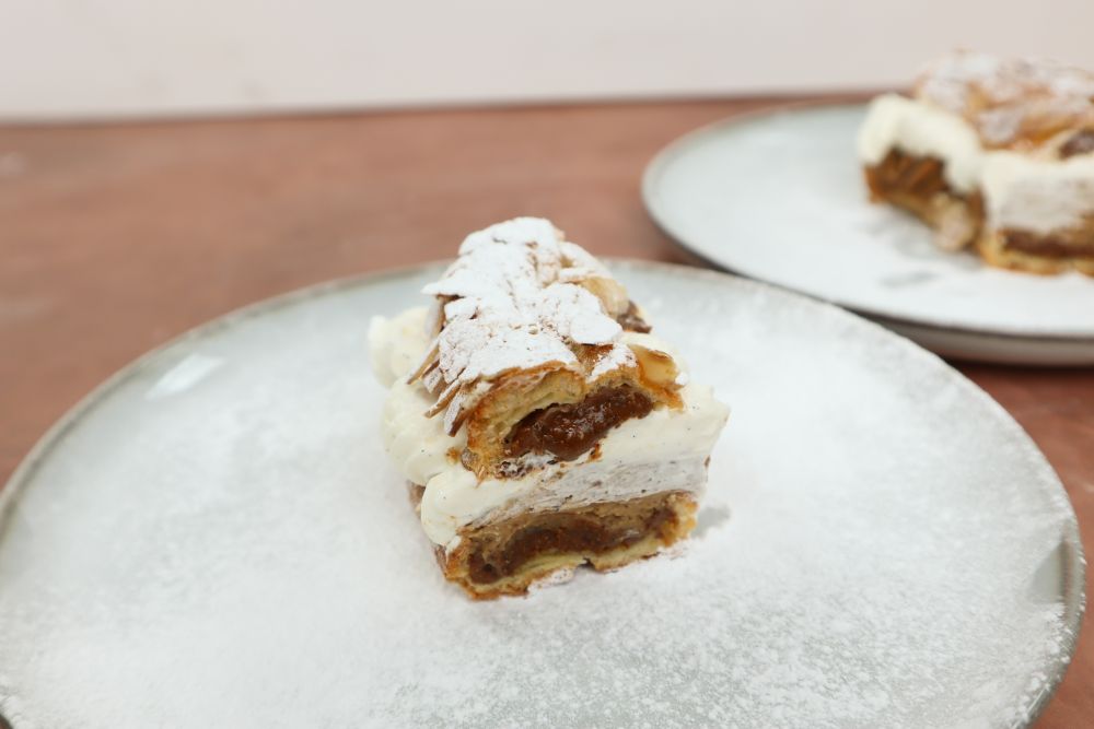 Golden rings of crisp choux pastry, filled with billowy vanilla cream and a rich, nutty hazelnut-almond mousseline, this Paris-Brest is as elegant as it is indulgent. Inspired by the classic French patisserie, it’s finished with a dusting of icing sugar and a scattering of flaked almonds for a little extra crunch. Each bite is a perfect balance of lightness and depth, making it a real centrepiece dessert that’s made for sharing.